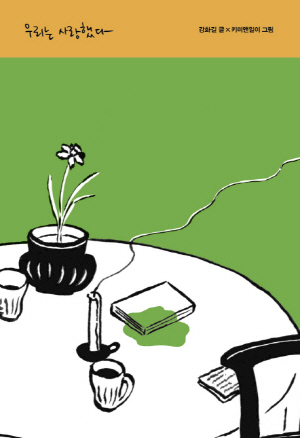 <테이크아웃>의 다섯 번째 이야기는 강화길과 키미앤일이가 전하는 『우리는 사랑했다』이다. 길었던 죽음의 과정 이후 우리의 영혼은 어떤 현실을 마주하게 될까. 꿈같은 이야기 속 슬픔을 간직한 차가운 영혼인 나는 키미앤일이의 무심한 듯 자상한 이미지들과 함께 형광 그린의 컬러로 표현되었다. 솔직한 선으로 그린 인물들의 무표정으로 차가운 영혼이 지녔을 공허함을 담담하게 보여 주었고, 비어 있는 공간으로는 영혼이 있을 자리와 시선을 보여 주었다. 그림 속 공간과 소설 속의 이어지는 대화로 독자는 죽음 이후 사랑에 매달리는 차가운 영혼의 마음을 만날 수 있다.