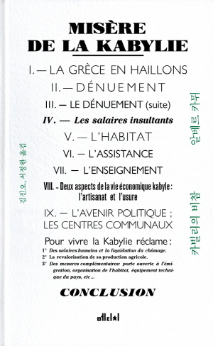 카빌리의 빈곤은 유입 자금의 급격한 감소 탓이다. 카빌리인은 비싼 밀값을 감당하지 못한다. 경제공황으로 본토인 프랑스의 일자리가 사라지면서, 카빌리인은 굶주림에 무방비 상태로 노출되었다. 프랑스로 향하는 절차마저 복잡해지면서, 카빌리는 점점 더 고립되어 간다. 카뮈는 상황의 심각성과 불합리함을 정확한 단어로 써 내려 간다.