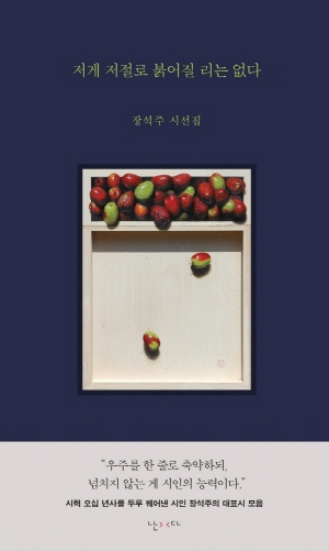 장석주 시인의 시선집을 펴낸다. 『저게 저절로 붉어질 리는 없다』라는 제목은 시인의 의지와는 상관없이 시인의 대표작으로 많은 독자들이 손꼽아온 그의 시 「대추 한 알」에서 가져왔다. 대추 한 알, 그것이 저절로 붉어질 리 없고 그것이 저 혼자 둥글어질 리 없음을 아는데도 시인의 시에서 ‘대추’를 읽는 동시에 대추라는 ‘우주’를 재발견하게 되는 찰나의 짜릿함, 그래서 시는 계속 태어나고 그러므로 시는 계속 읽히는 것일 테다. 표지에 액자처럼 걸린 이목을 작가의 그림 또한 대추를 소재로 하였으나 그 제목을 <공 708>이라 함으로 보는 순간 그 시야가 무한히 확장된다 할 적에 그 ‘공’은 앞서 말한 우주와 그 맥을 함께하고 그 궤에 함께 꿰는 말이리라.
