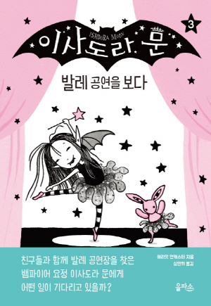 이사도라 문은 요정 엄마와 뱀파이어 아빠를 반씩 닮은 ‘뱀파이어 요정’입니다. 이사도라가 가장 좋아하는 건 밤하늘의 별들 사이를 날아다니는 거, 박쥐 무늬 찻잔 세트에 반짝이 가루를 넣고 티 파티하는 거, 그리고 발레 연습입니다. 가장 친한 친구인 분홍 토끼와 함께 뱀파이어 아빠의 까만색 망토로 무대 커튼을 만들면 요정 엄마가 마법으로 예쁘게 꾸며 주지요.